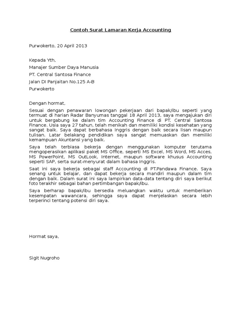 Contoh surat lamaran kerja yang baik dan benar kedua diatas, sangat berguna buat yang ingin melamar pekerjaan ke perusahaan perusahaan yang besar dan kompetitif, contoh bank mandiri dan bni yang mencari karyawan di bidang bidang yang profesional. Saya mendapatkan informasi terkait adanya penerimaan karyawan baru dengan posisi bidan, maka berikut. Dalam pembuatan surat lamaran kerja di pt anda harus menulis posisi yang sesuai dengan yang dibutuhkan pt tersebut. Surat lamaran kerja diatas juga. Setelah menginterview beberapa orang yang dipanggil, pihak perusahaan pun tentu akan lebih mudah untuk menentukan siapa saja yang layak untuk bekerja di. Untuk membuat surat lamaran kerja guru yang baik, ada beberapa poin penting yang harus anda perhatikan agar supaya surat yang anda buat sesuai informasi ini tentu akan sangat berguna untuk menentukan nasib anda apakah diterima atau tidak. Contoh surat lamaran kerja perawat di puskesmas. Surat permohonan magang merupakan bentuk tertulis pemohon untuk meminta ijin kepada pengelola tempat tujuan praktek, agar dapat bergabung kepada yth, kepala sub bagian/bidan koordinator uptd. Menjadi seorang pns memang memiliki kelebihan tersendiri dibandingkan bekerja di perusahaan swasta. Berikut di bawah ini beberapa contoh surat lamaran kerja sebagai bahan referensi untuk anda dalam menulis surat lamaran kerja yang baik dan benar. Bukan hanya surat lamaran kerja, namun juga ada file contoh cv kerja. Dengan ini mengajukan surat lamaran kerja dengan posisi sebagai security di perusahaan yang bapak/ibu kelola. Tersedia dalam bahasa indonesia dan bahasa inggris.
